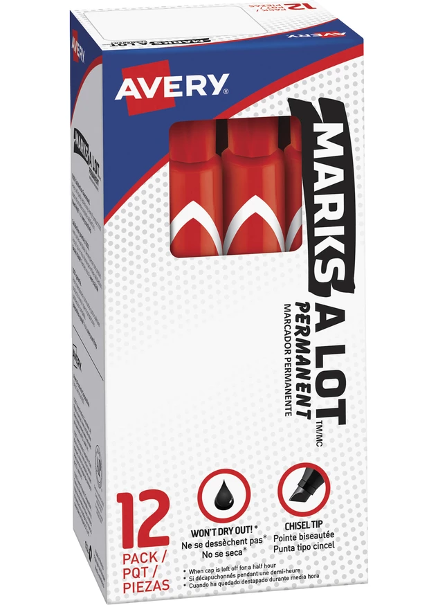Avery Marks-A-Lot Desk Style Red Large Permanent Marker with a chisel point ensures a high visibility with bold, low odor permanent ink that is quick drying and water and rub resistant. A wide variety of line widths are marked conveniently with a 3/16 in jumbo tip.