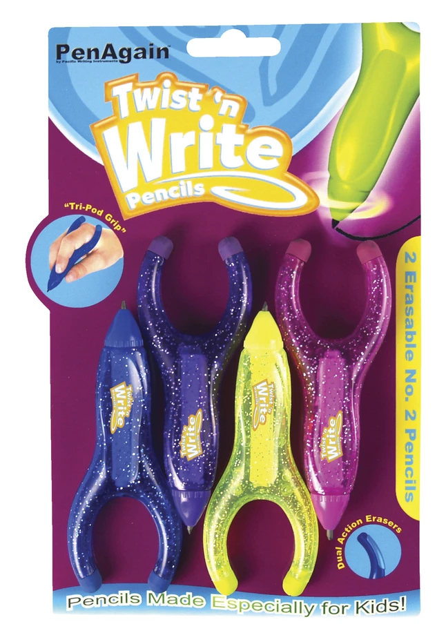 Baumgartens #2 Twist ‘n Write Pencil is ergonomically correct making it perfect for kids. It assists kids to write properly by using the right tri-pod finger posture and teaches kids the correct way to write. Pencil comes with dual action erasers and extendable #2 pencil lead. Assorted color twist n write pencil is sold as 4 per pack that includes 1 each of purple, pink, green and blue.