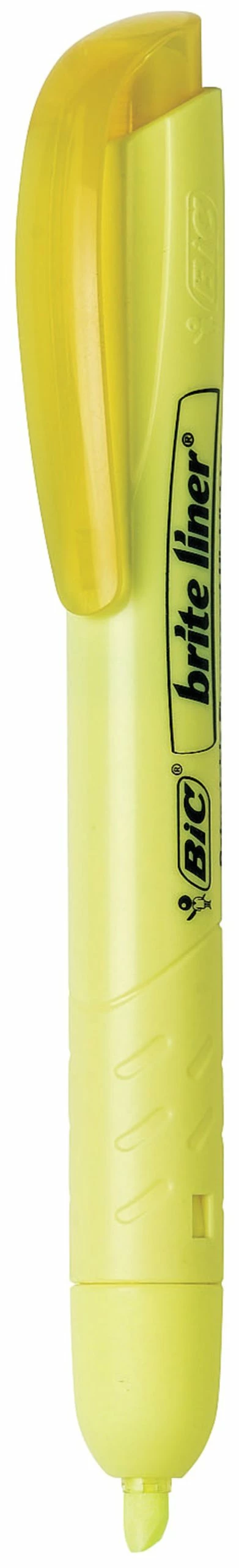 BIC Brite Liner Yellow Retractable Highlighter with no cap can be used by just clicking. Retractable highlighter features molded grip zone for added control while seal guard defends against dry out. Chisel tip highlighter renders broad line for highlighting or fine line for underlining, sold as 12 per pack.