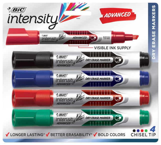 New ๐ฏ BIC Intensity Advanced Dry Erase Low Odor Marker, Tank, Chisel Tip, Assorted, Set Of 4 ๐