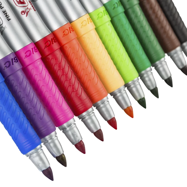 BIC Intensity Permanent Marker Set in assorted colors featuring rugged conical tips with extended cap-off-time to ensure durability has pen style barrel and textured grip for providing comfort and control. Fine point marker ideal for photos, glass, coated papers, CDs, plastic, regular paper is long-lasting and is sold as 36 per pack.