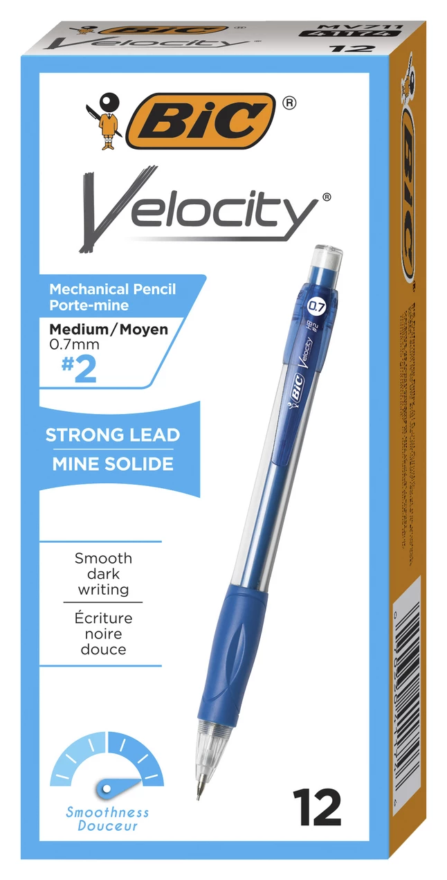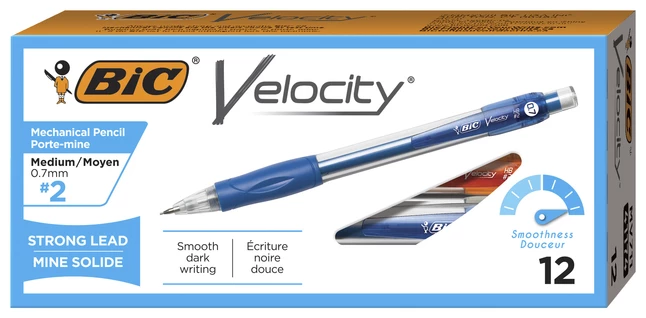 BIC Velocity Blue Mechanical Pencil features a slim, translucent barrel with a cushioned grip and an eraser. Latex-free pencil with 0.7 mm traditional lead includes three #2 leads and is sold as 12 per pack.