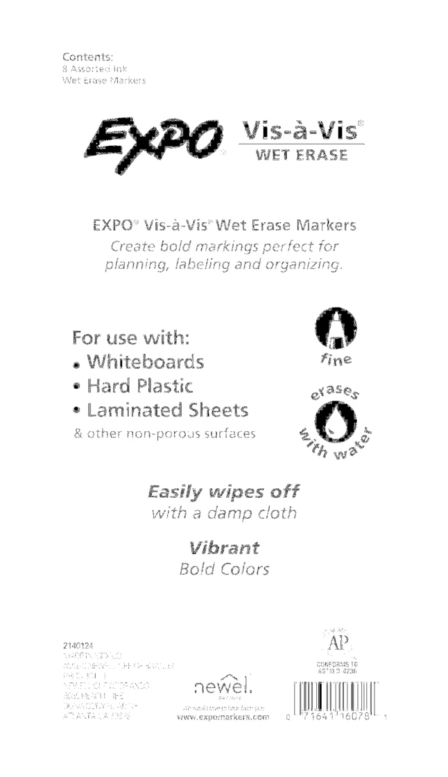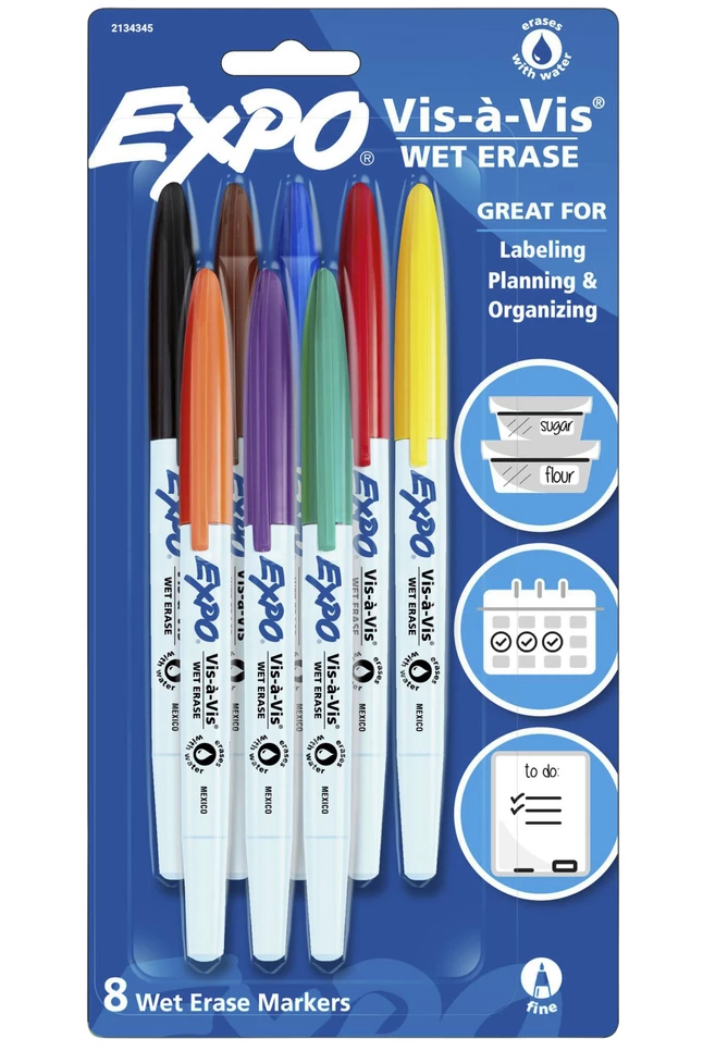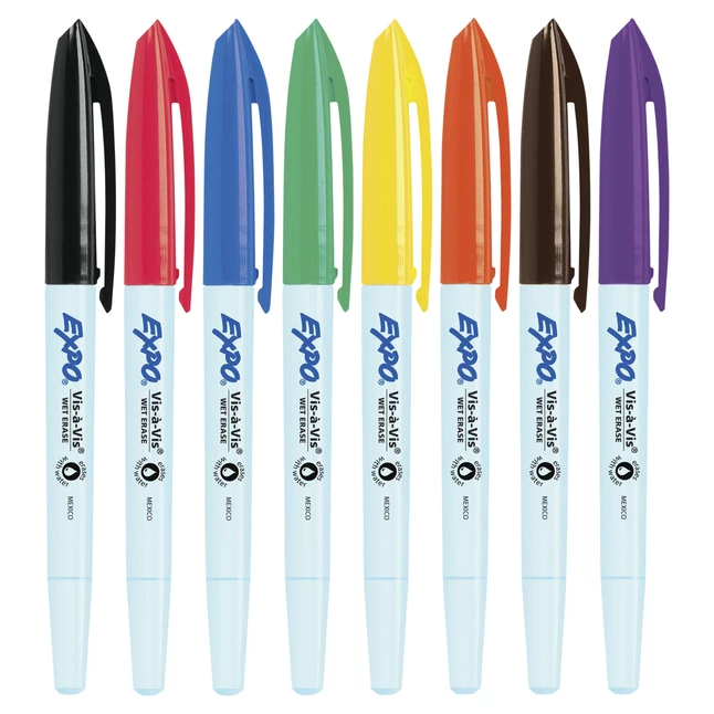 Label, plan, and organize with ease with EXPO Vis-ร -Vis Wet Erase Markers. Depend on EXPO wet erase markers for writing or drawing on whiteboards, hard plastic, laminated sheets, and other nonporous surfaces. These EXPO markers feature ink that easily wipes off with a damp cloth. Available in a variety of vibrant colors, the fine-tip markers leave fine detailed lines even in small spaces.