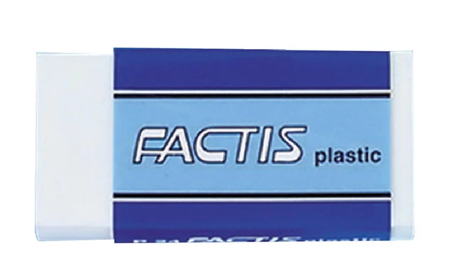 Factis Graphite Plastic Eraser measuring 1-7/8 x 7/8 x 3/8 inches is self-cleaning and nonabrasive. A superior multi-purpose eraser is specially formulated for use on films and tracing papers to remove graphite lines thoroughly without ghosting. Latex-free white eraser is sold as 24 per box.
