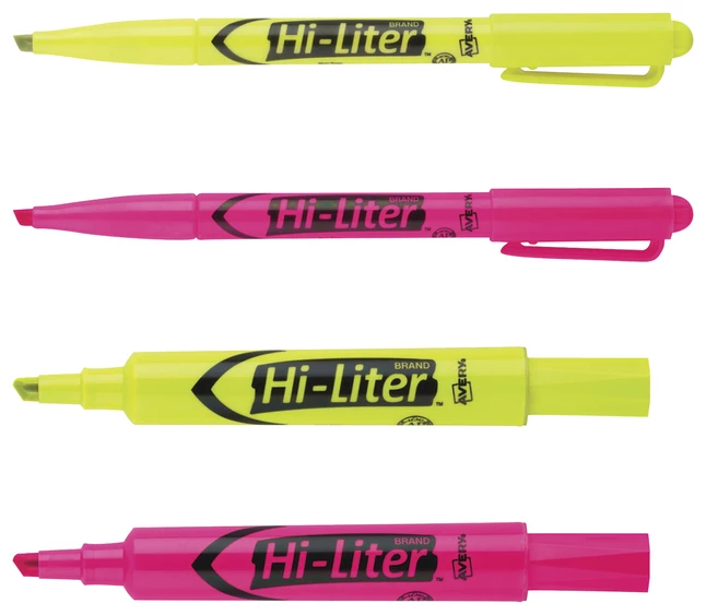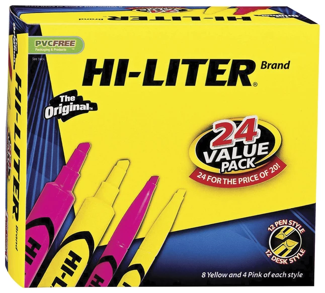 HI-LITER Chisel Tip Desk and Pen Style Highlighter Combo Value Pack – 24 for the price of 20! The Original highlighter, since 1962. Brilliant colors. Durable plastic tip for smooth highlighting – will not fray. Leave cap off for one week without drying out. Non-toxic, quick-drying. Conforms to ASTM D4236. ACMI certified to meet Federal standards of non-toxicity; safe for office, school, or home.