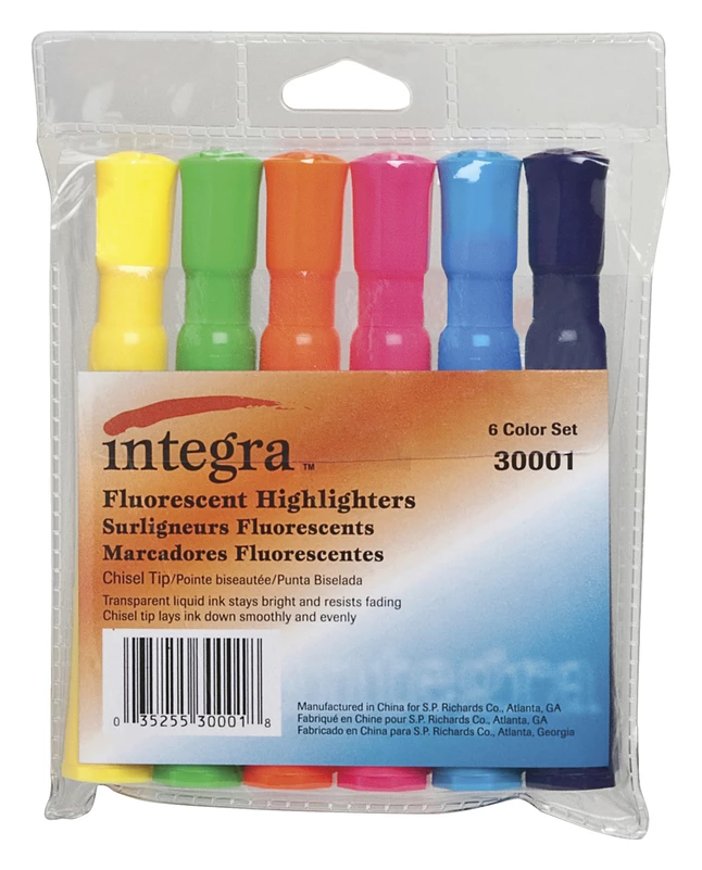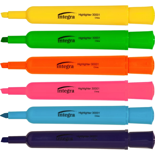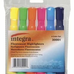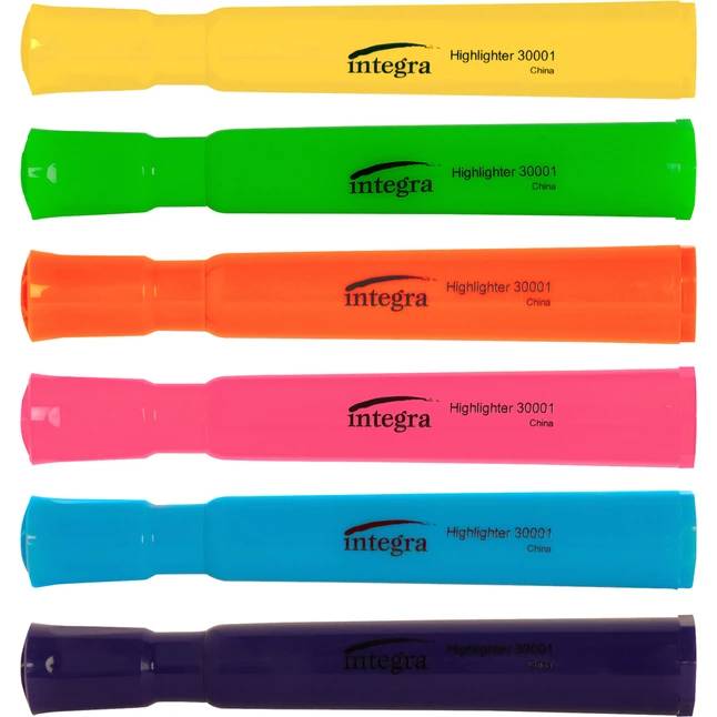Integra Chisel Desk Highlighter Set of 6 includes highlighters in fluorescent yellow, fluorescent pink, fluorescent blue, fluorescent green, fluorescent orange and fluorescent purple colors. Highlighters feature a large barrel and chisel tip and ink is transparent liquid that stays bright and resists fading and is sold as 6 per pack.