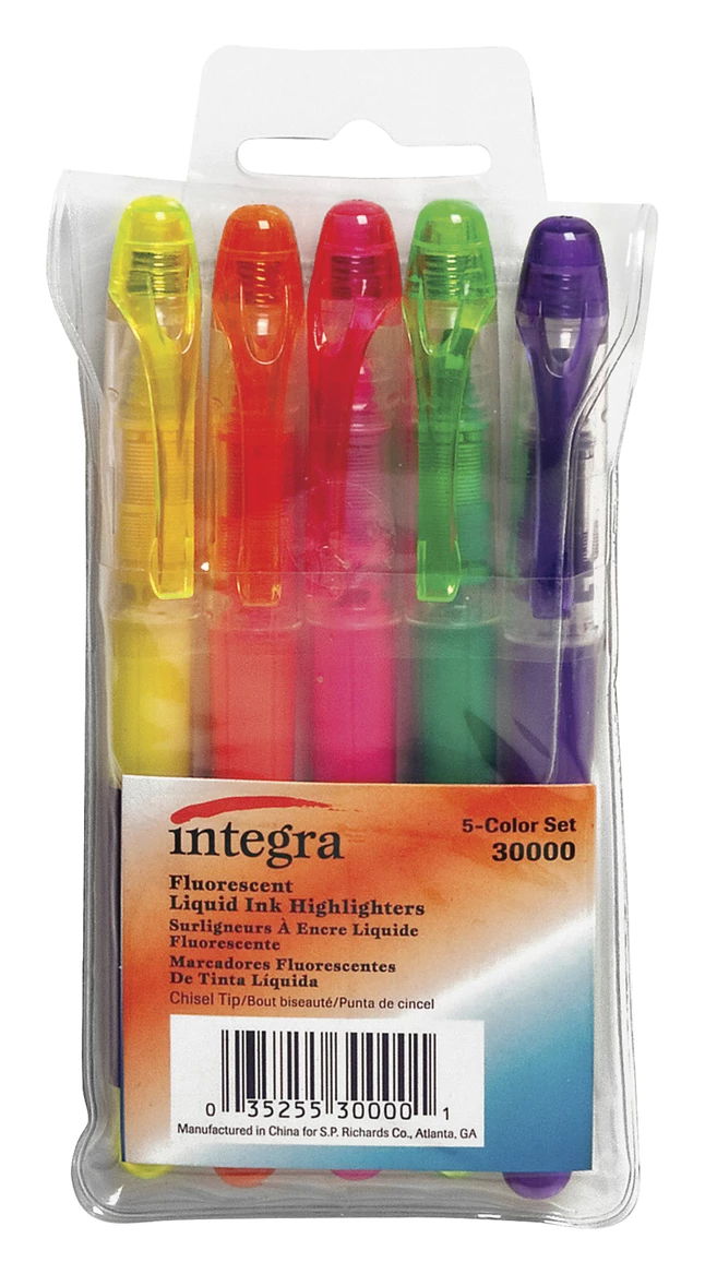 Integra Liquid Pen-Style Highlighter Set of 5 includes highlighters in fluorescent yellow, fluorescent pink, fluorescent purple, fluorescent green and fluorescent orange colors. Highlighters feature a visible ink supply and ink is transparent liquid that stays bright and resists fading.