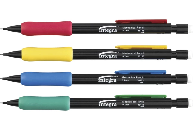 Integra Grip 0.7 mm Mechanical Pencil with black barrel features a rubber grip and an eraser. Pencil includes 3 full-length leads and can be refilled using standard lead. Pencil comes with assorted color pocket clip that includes 3 each of red, yellow, blue, green.