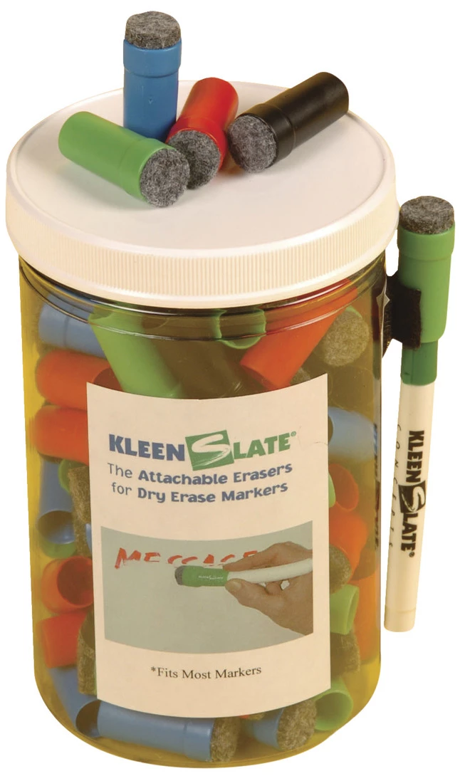 Small eraser cap fits most small dry erase markers. They are easy to clean and erase without leaving marks. Sold as 100 erasers per pack in black, red, blue and green.