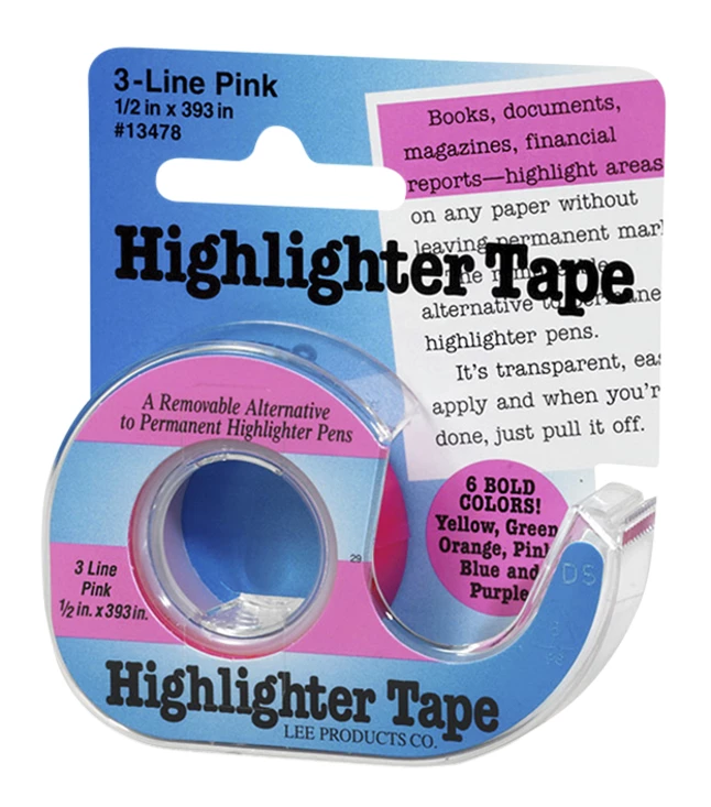 Lee Pink Highlighter Tape measuring 1/2 in wide highlights 3 lines of print or spaces. Easy to use by just tearing off as much or as little as desired from the dispenser roll measuring 393 in, applying and/or repositioning it and removing it without residue when its done. Notes or highlighted text can be written on it.
