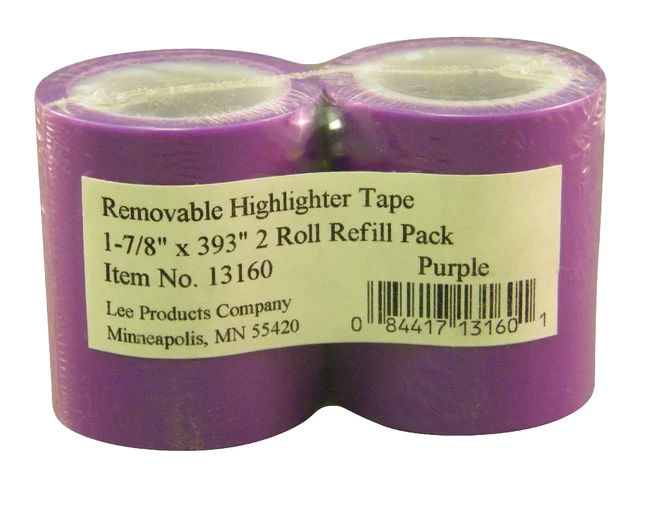 Lee Wide Purple Highlighter Tape Refill measuring 1-7/8 in wide highlights 3 lines of print or spaces. Easy to use by just tearing off as much or as little as desired, applying and/or repositioning it and removing it without residue when its done. Notes or highlighted text can be written on it. For use with 13154 Empty Dispenser.