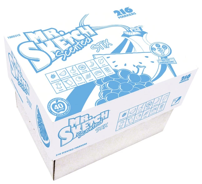 Mr Sketch Premium Scented Watercolor Marker in assorted colors is water soluble and does not bleed. Easy to set-up box contains 18 sticks in each of 12 brilliant and is perfect for any classroom. Marker is Non-Toxic and features stix fine tip. Cost effective school pack marker comes in a durable organizer box and is sold as 216 per set.