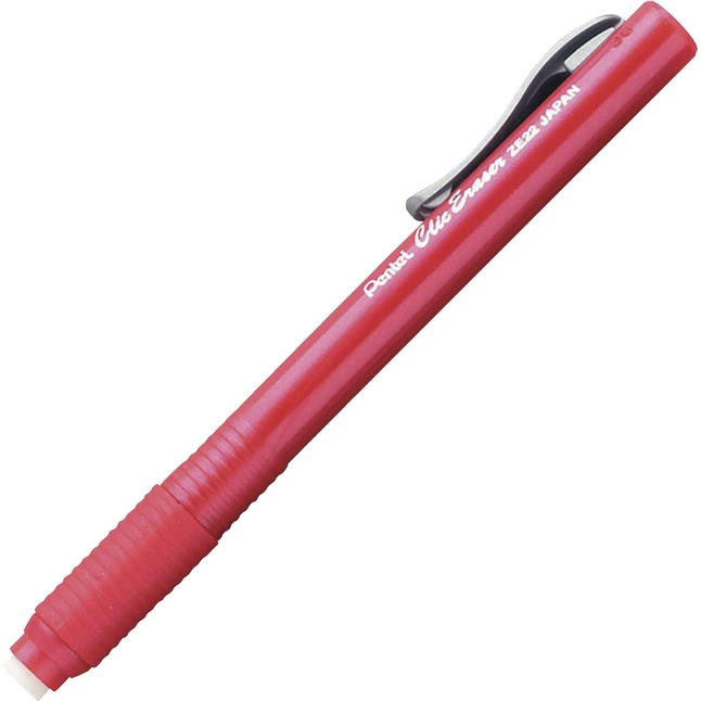 Pentel Red Barrel Clic Eraser with the latex-free grip provides maximum comfort and control. Pocket clip retracts/advances eraser with a clic. Premium white eraser removes lead cleanly and easily without smearing, scuffing or tearing writing surface.
