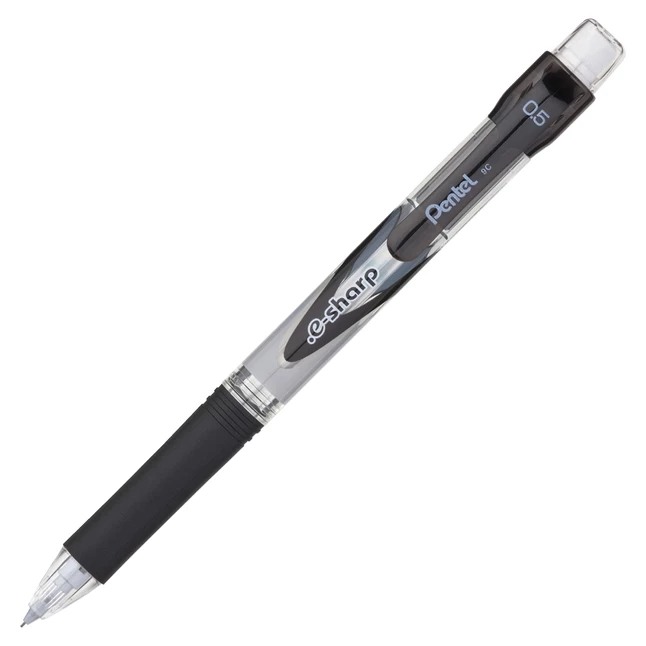 Pentel.E-Sharp 0.5 mm Black Mechanical Pencil features a latex-free grip to offer maximum comfort as well as control. Pencil has lead that automatically falls in line inside with the Pentel lead maximizer system to minimize wasted lead. It protects pockets and purses with fully retractable tip. Pencil comes pre-loaded with Pentel super hi-polymer and does not require sharpening. It is very strong and creates a clear dark line. It comprises of 72% recycled content apart from consumable content and refills. It can be refilled using Pentel super hi-polymer lead and PDE-1 eraser. Pencil is sold as 12 per pack.