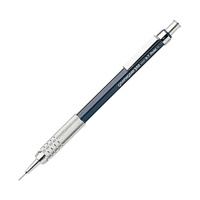 Pentel Graph Gear 500 0.7 mm Blue Pencil features a 4 mm tip design that is perfect for use with rulers and templates. Pencil is ideal for precise drafting and template work. It has a sleek beveled barrel featuring metallic mesh grip that increases control while writing. Refillable pencil utilizes Pentel super hi-polymer lead and Z2-1 refill eraser.
