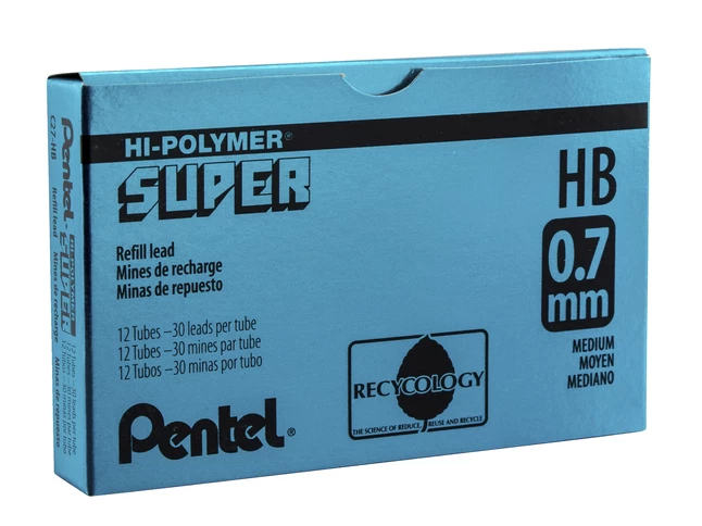 Pentel Super Hi-Polymer HB lead is equivalent to a #2 pencil, guaranteed to scan on tests, resists breaking and never needs sharpening. Each tube of Pentel Super Hi-Polymer HB lead is made of 100% recycled plastic and part of the Pentel Recycology line of products. Produces crisp, fine lines of consistent density. Ideal for all general writing applications such as notes, letters, etc. 30 pieces of 0.7 mm lead included in each tube. Sold as a pack of 12 Tubes.
