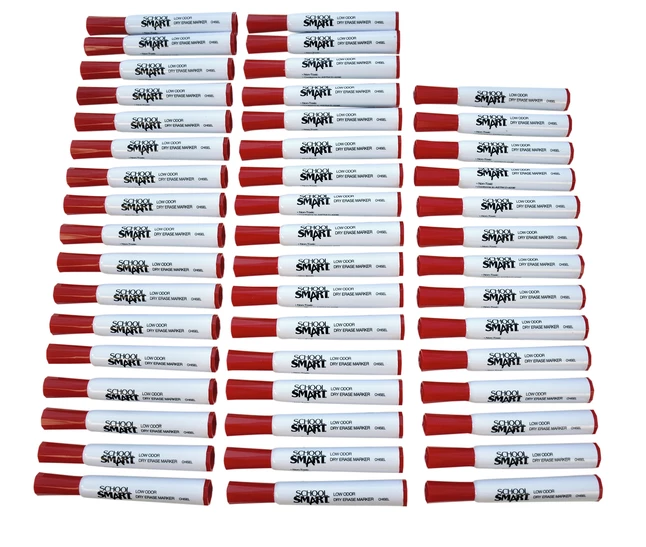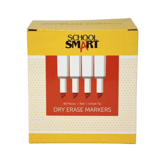School Smart Dry Erase Chisel Tip Tank Style Marker features low-odor, non-toxic ink formula that is easily erasable while providing smooth ink flow. This marker produces rich, solid and bright colors on whiteboards, glass and other non-porous surfaces. Sold as 48 markers per pack in red color.
