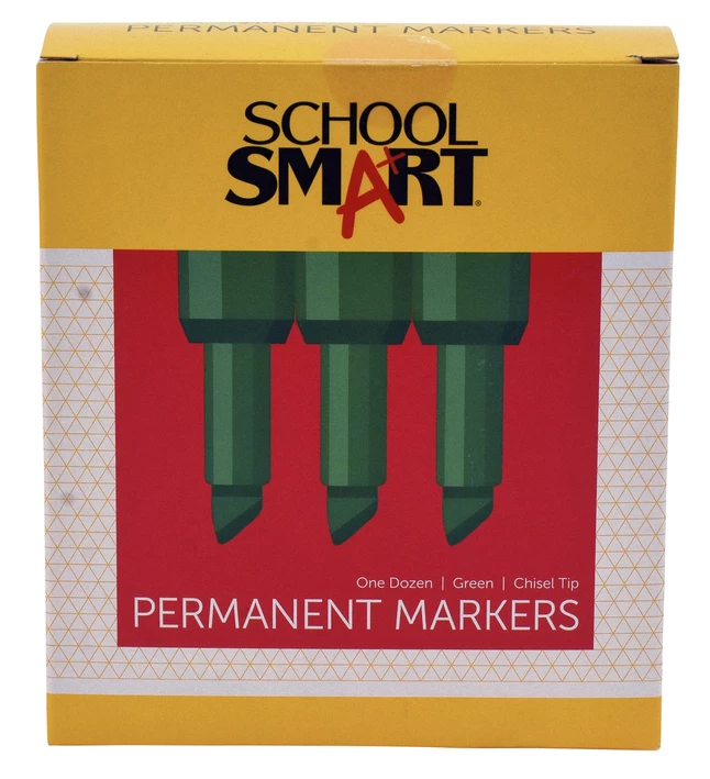 School Smart Green Permanent Marker marks on most surfaces and is non-toxic. It comes with a broad chisel tip providing a wide range of coverage. It is sold as 12 per pack.