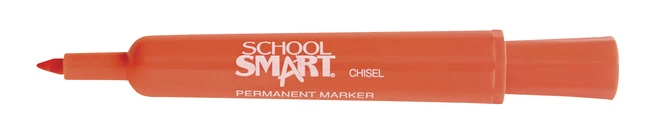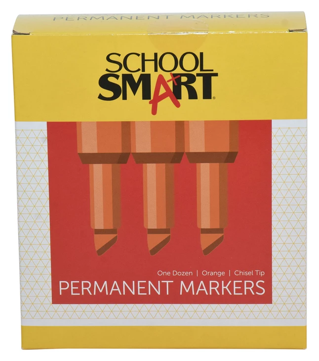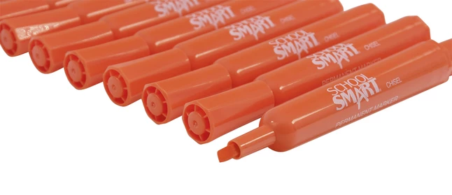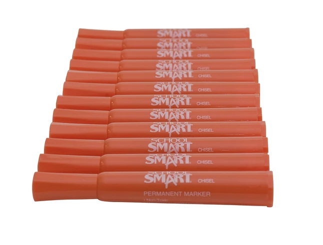 School Smart Orange Permanent Marker marks on most surfaces and is non-toxic. It comes with a broad chisel tip providing a wide range of coverage. It is sold as 12 per pack.