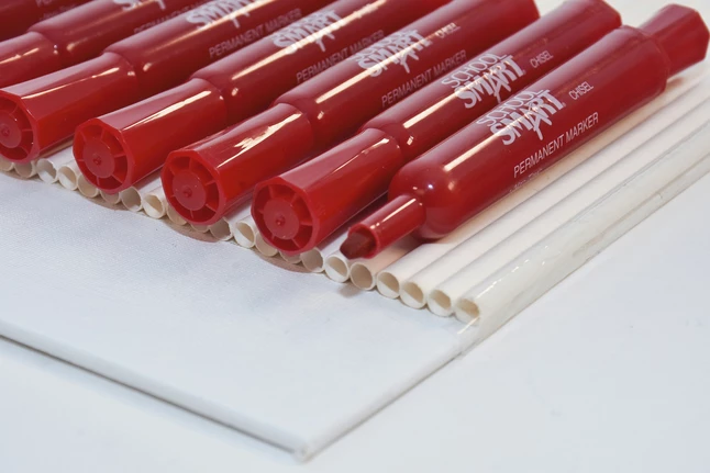 School Smart Red Permanent Marker marks on most surfaces and is non-toxic. It comes with a broad chisel tip providing a wide range of coverage. It is sold as 12 per pack.
