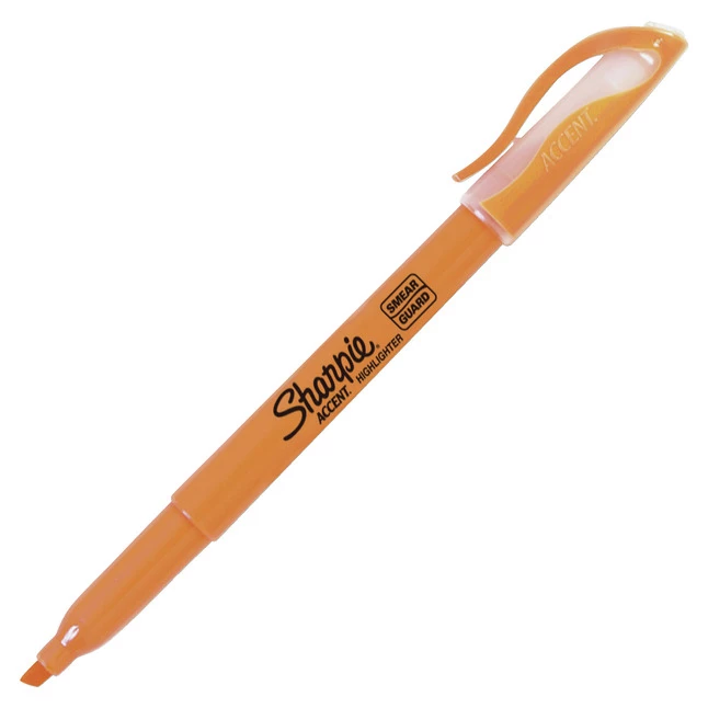Sharpie Pocket Style Fluorescent Orange Highlighter features a versatile chisel tip that is ideal for highlighting or underlining. Features smear guard ink technology that does not smear ink. Ink is odorless, non-toxic, quick drying and is sold as 12 per pack.
