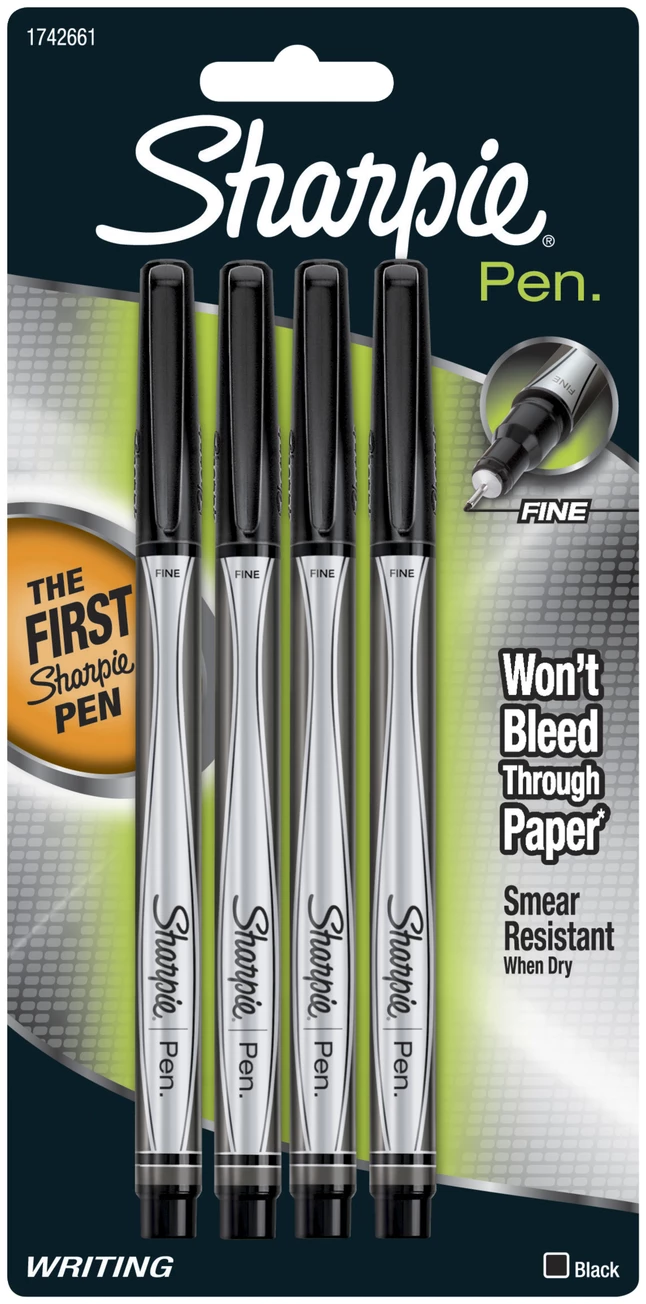 Sharpie Permanent Marker Pen in black ideal for taking notes, journaling, writing letters, making cards and many more has a durable medium or fine point plastic tip to render precise and consistent writing with minimal effort. Pen features bold permanent Non-Toxic ink that is smear resistant and acid-free. Pen is sold as 4 per pack.