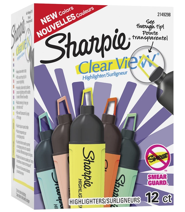 See where you’re marking with the Sharpie Clear View highlighter! A see-through tip allows you to keep your eyes locked on the page and precisely highlight-you’ll always know where to stop! Meanshile, the innovative blade-style tip lets you switch between both wide and narrow lines. Sharpie highlighters come with ultra-vivid ink that jumps off the page while resisting the smearing of many pen and marker inks, so your work stays clean.