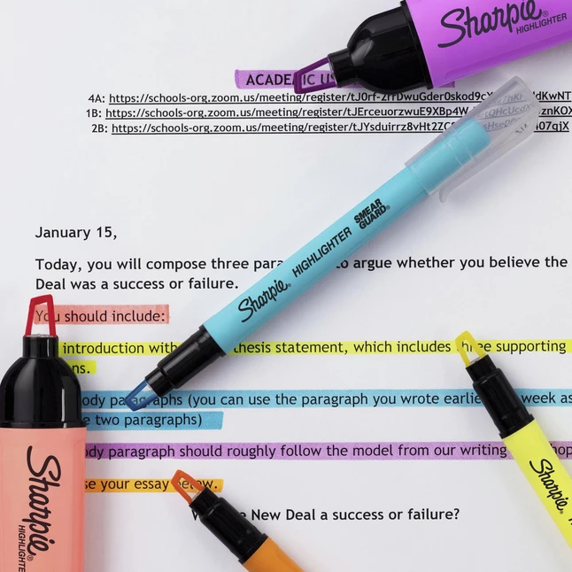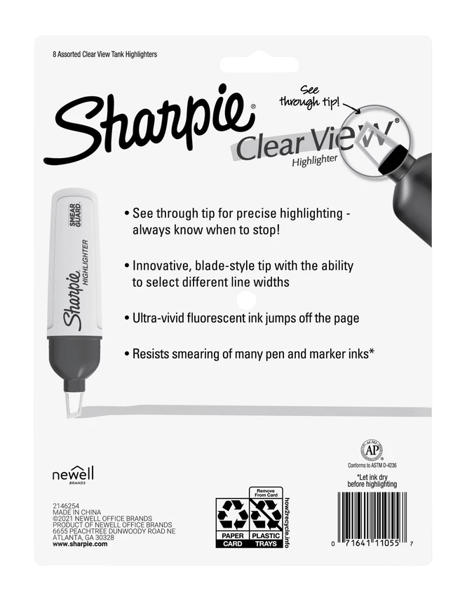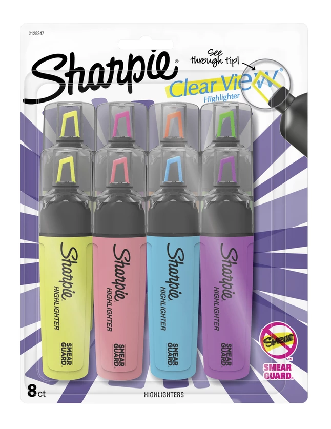 See where you’re marking with the Sharpie Clear View highlighter! A see-through tip allows you to keep your eyes locked on the page and precisely highlight-you’ll always know where to stop! Meanwhile, the innovative blade-style tip lets you switch between both wide and narrow lines. Sharpie highlighters come with ultra-fluorescent ink that jumps off the page while resisting the smearing of many pen and marker inks, so your work stays clean.