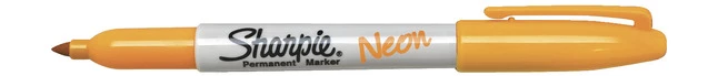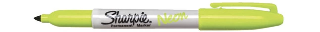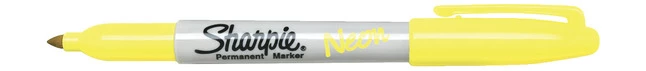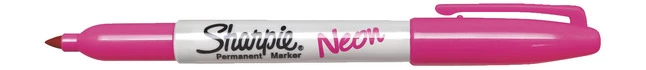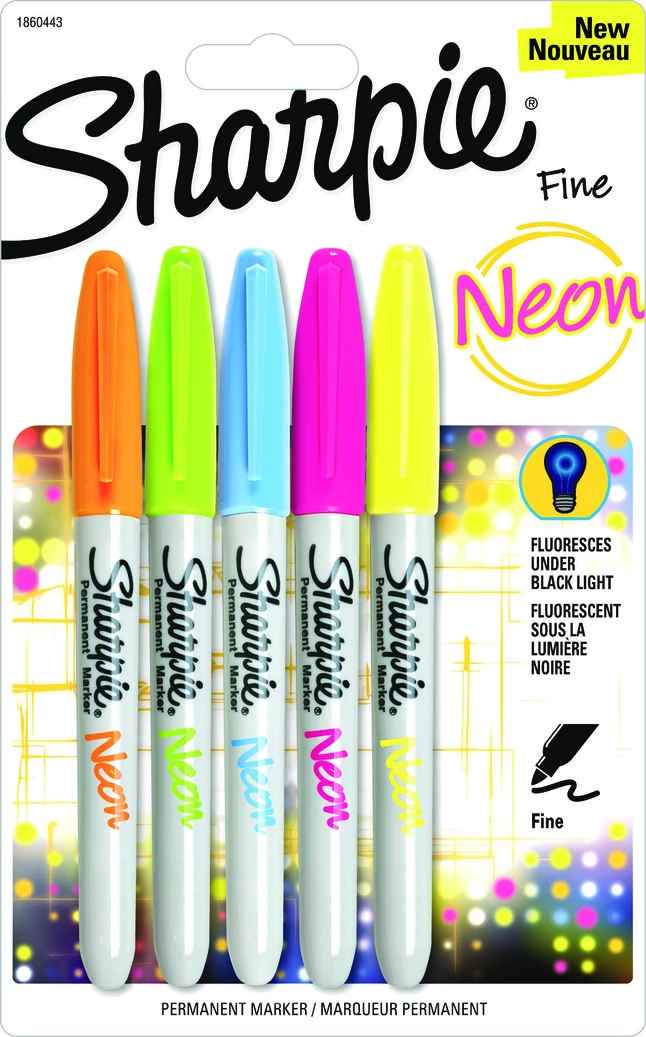 Sharpie Permanent Marker has waterproof ink and is great for identifying and labeling. Fine point marker marks bright, strong and permanent on most surfaces including metal, glass, plastic, foil, cloth, rubber, waxed paper etc. This marker comes with neon yellow, neon pink, neon orange, neon green and neon blue. It is sold as 5 per set.