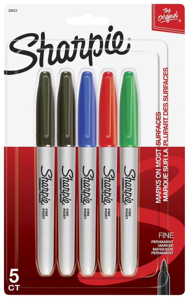Create bold expressions with Sharpie Permanent Markers. The set of 5 colorful permanent markers is ideal for making lasting marks that stand out on nearly any surface. Featuring a durable fine point, the Sharpie markers allow you to draw precise, enduring lines. The quick-drying ink is both smear and fade resistant.