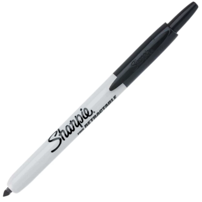 Sharpie Retractable Fine Point Permanent Marker in black features unique safety seal valve design for preventing dryout and creates no fuss. Marker has no cap and is sold as 12 per pack.
