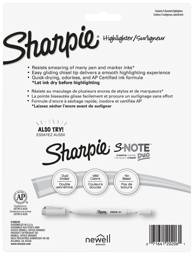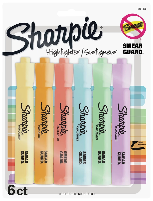 Perfect for when info is high priority and precision is a must, Sharpie Highlighters make everything highly visible with transparent, smooth, and quick-drying ink. These wide-barreled tank highlighters feature a large ink supply for dependable and long-lasting use and an easy gliding chisel tip that highlights and underlines both wide and narrow lines of text. The quick-drying ink resists smearing many pen or marker inks, while the versatile chisel tip highlights and underlines both wide and narrow lines of text. And with an array of mild, pastel colors, these Sharpie highlighters are perfect for softer highlighting that still stands out on the page. It’s no wonder why Sharpie is the got-to-have highlighter for life’s major high points.
