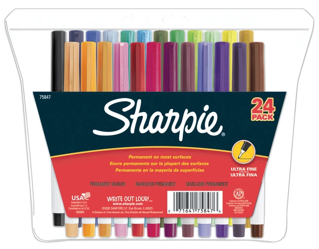 Sharpie Ultra Fine Permanent Marker features waterproof ink that is great for identifying and labeling. Marker has a durable ultra fine point tip that produces thinner, precise lines on most surfaces like metal, glass, plastic, foil, cloth, rubber, waxed paper and more. Marker set of 24 includes one color each of black, slate gray, navy, blue, blue ice, turquoise, green, lime, mint, yellow, peach, orange, pink lemonade, magenta, berry, red, boysenberry, purple, brown, valley girl violet, argyle green, banana clip yellow, jelly pink, and leg warmer orange.