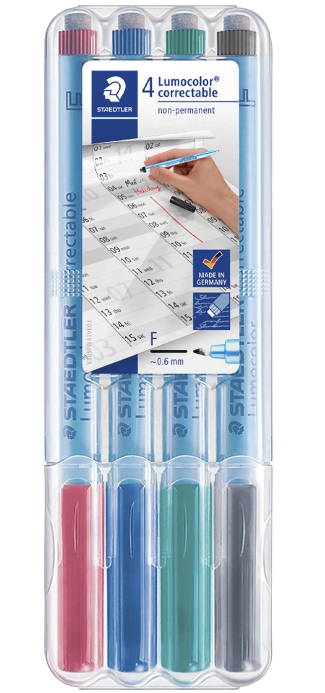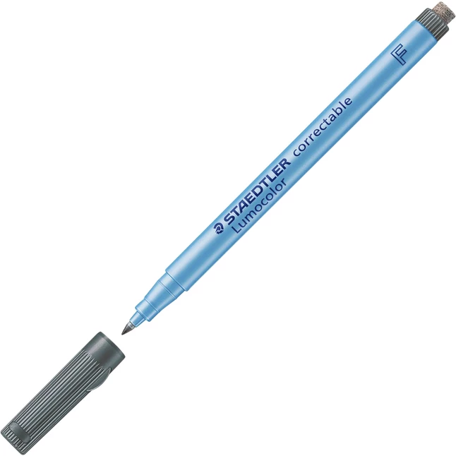 Staedtler Lumocolor Fine Point Dry-Erase Markers write on uncoated transparencies, write-on films, laminates, sheet covers, whiteboards and overhead projection slides. Their water-soluble, color-intensive, lightfast, low-odor ink does not bleed through paper. Pens have integrated wipers on one end for minor corrections. For larger corrections, separate correctable hand wiper blades (sold separately) can be attached to the pens so they are always ready and don’t get lost. No need to worry about accidental erasures, writing adheres even when film is turned over. Automatic pressure equalization prevents pens from leaking during airplane flights. Marker pens are easily refillable.