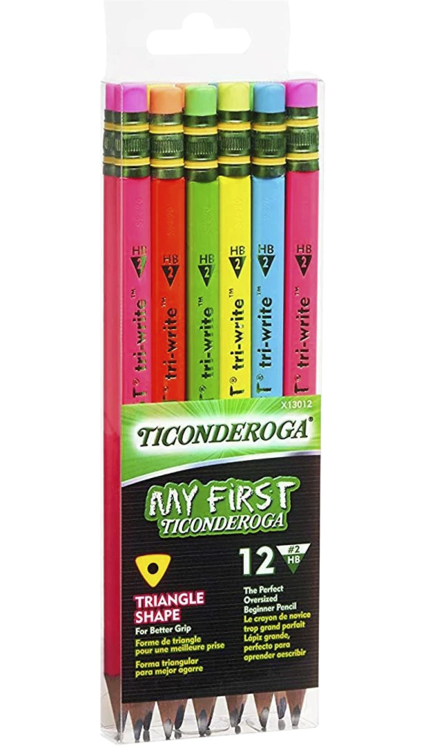 The Ticonderoga beginner pencil that teachers and parents love is now available in bright neon colors! This triangular shaped, over sized pencil is ideal for children in the early stages of their writing development. The large size (13/32 in) is easy for small hands to hold while the naturally ergonomic, triangular shape helps teach correct pencil grip. Matching neon latex-free erasers. The thick graphite No 2 core delivers a broad smooth line. Premium wood harvested from responsibly managed sources provides smooth, even sharpening with minimal breakage. Teachers prefer Ticonderoga for its dependability and craftmanship.